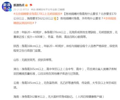 并不止陕西省发出了捐精倡议书,其他多地比如北京、山东、云南、湖北、海南等也都在最近发出了捐精倡议书,且各地对报名者的要求都不尽相同,也引发了人们的关注和讨论。