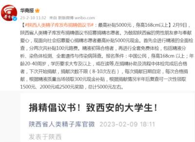 2月9日,陕西省人类精子库发布捐精倡议书招募捐精志愿者,给志愿者的最高补贴是5000元现金。报名条件包括:中国公民,身高168cm以上,年龄20-40周岁,学历大专以上或在读等。
