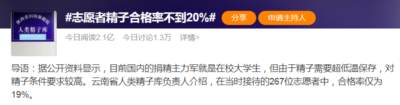 另一方面,还有一个数据值得关注,那就是捐精志愿者的精子合格率。据公开资料显示,目前国内捐精主力军是在校大学生,但由于精子需要超低温保存,对精子条件要求较高,志愿者通过率不超过20%。陕西省人类精子库是这样,云南省人类精子库也是这样。