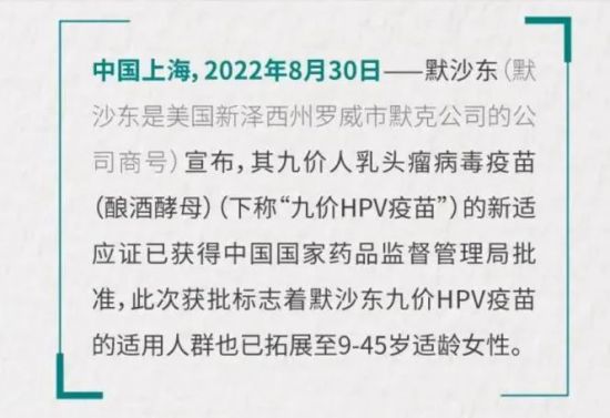 默沙东宣布九价HPV疫苗接种年龄由原来的16-26岁,变成了9-45岁。