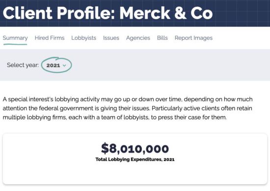 在Opensecrets(美国政治捐献数据库)网站上,记录了默沙东2021年的游说支出——801万美元。
