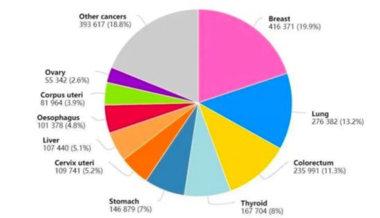 根据国家癌症中心2022年公布数据,在女性群体中,癌症新发病例数前三的癌症分别是乳腺癌42万,肺癌28万,结直肠癌24万。