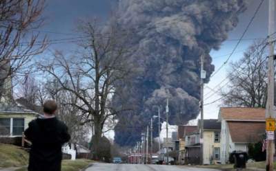 当地时间2月3日,一列运载危险化学物质氯乙烯的货运火车,在美国俄亥俄州脱轨后引发火灾。