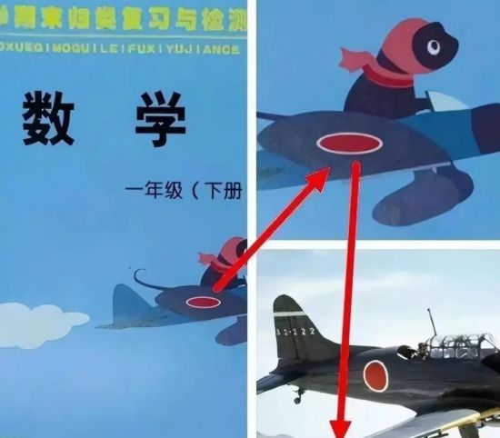 在一幅看不出来源的数学一年级(下册)辅导教材封面上,配图却是一架日本军机,机身和机翼上都赫然印着日本太阳旗,中国那么多歼20不配上课本?