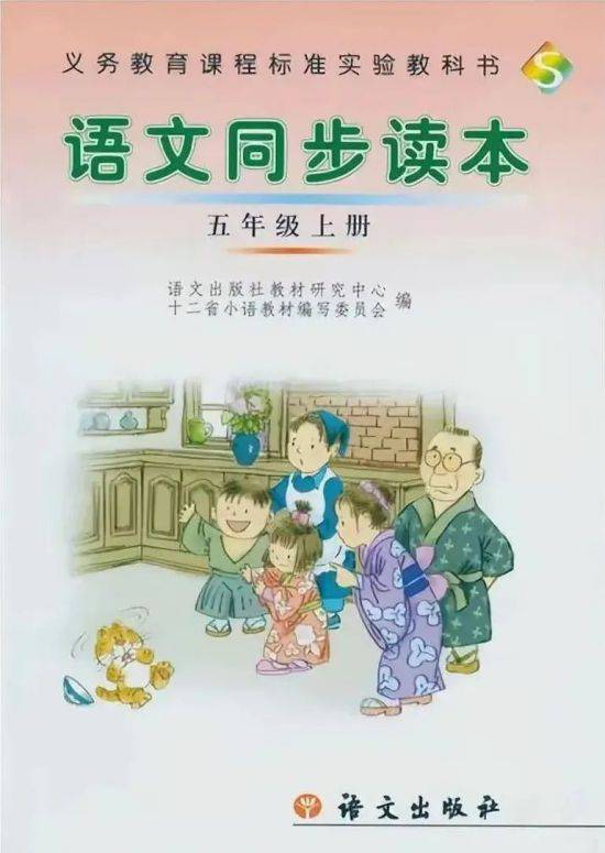 五年级《语文同步读本》封面上,画的却是一个穿着和服的日本家庭,画面中的五个人,唯一一个穿着中国服装的中国人,却还是个系着围裙的仆人!