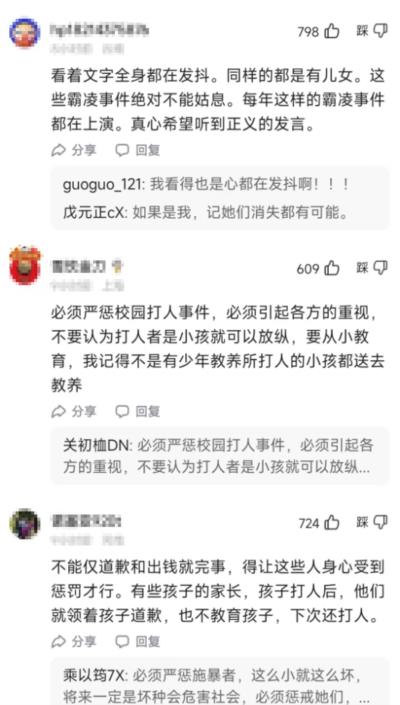 “未成年霸凌,绝对不能姑息迁就了,以未成年草草了解,受害者一生的阴影谁来负责?未成年也一样要受到严惩,只有这样才能遏制嚣张气焰。”
