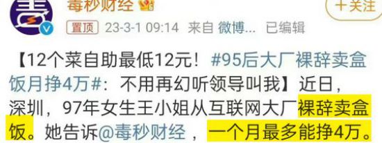 97年女孩裸辞卖盒饭,一个月挣4万;95后裸辞开麻将馆当保洁,3小时挣3万;95后女孩毕业收破烂月入过万……