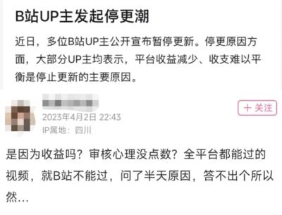 还有最近B站的停更潮,很多上百万粉丝的UP主都不再更新了。江湖上普遍说法是B站收益变少了,收支难平衡,没钱了。
