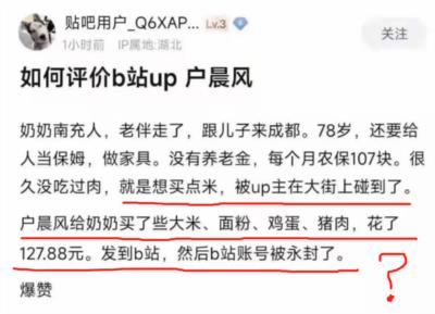 想起来了,还有UP主“户晨风”因为拍摄底层人民给他们买东西,就这被封了: