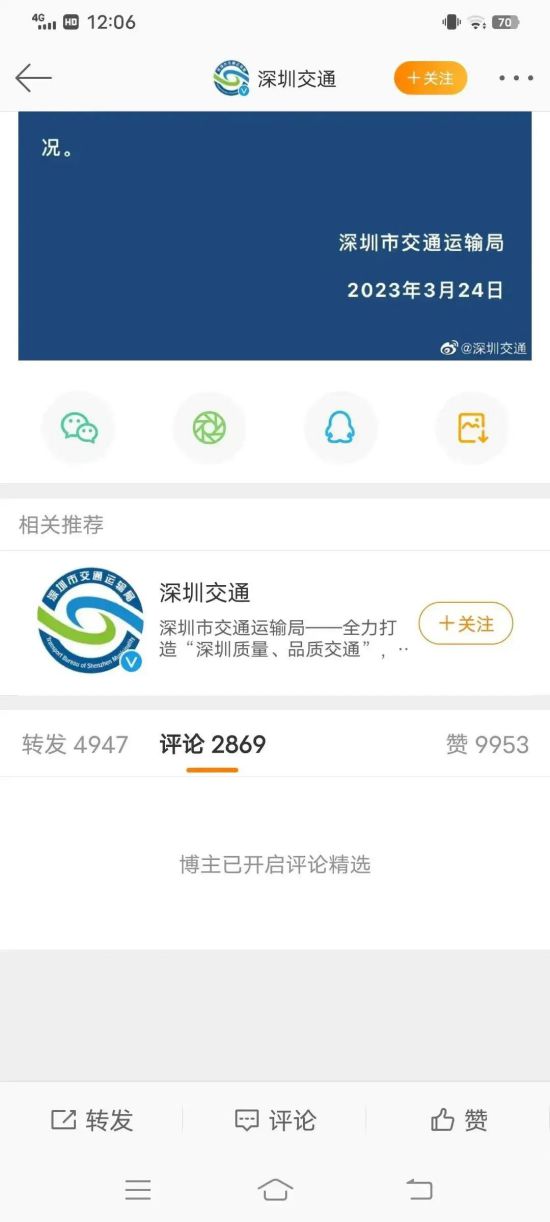 一心想要个结果的我找到了深圳交通局的官方账号,却发现不知何时开始这个账号连评论都看不了。