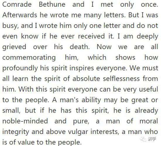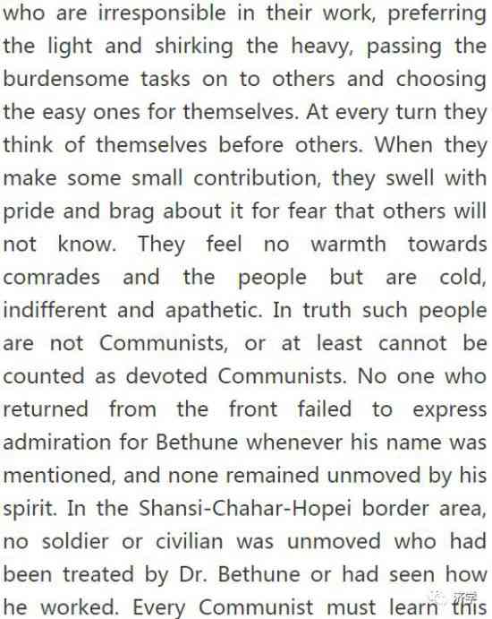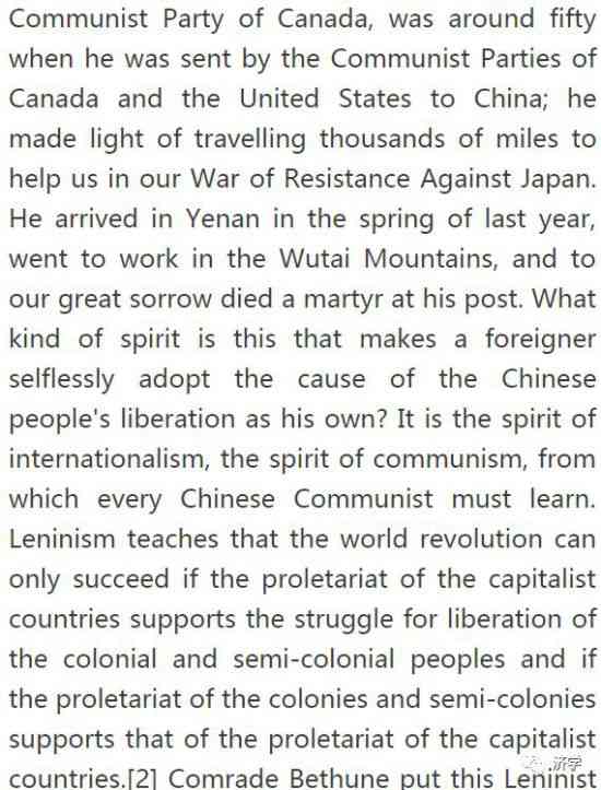 1. The distinguished surgeon Norman Bethune was a member of the Canadian Communist Party. In 1936 when the German and Italian fascist bandits invaded Spain, he went to the front and worked for the anti-fascist Spanish people. In order to help the Chinese people in their War of Resistance Against Japan, he came to China at the head of a medical team and arrived in Yenan in the spring of 1938. Soon after he went to the Shansi-Chahar-Hopei border area. Imbued with ardent internationalism and the great communist spirit, he served the army and the people of the Liberated Areas for nearly two years. He contracted blood poisoning while operating on wounded soldiers and died in Tanghsien, Hopei, on November 12, 1939
