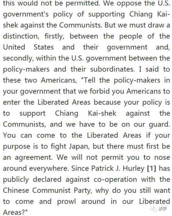 l. Patrick J. Hurley, a reactionary Republican Party politician, was appointed U.S. ambassador to China towards the end of 1944. In November 1945 he was forced to resign because his support for Chiang Kai-shek's anti-Communist policy roused the firm opposition of the Chinese people. Harley's open declaration against cooperation with the Chinese Communist Party was made on April 2, 1945 at a U.S. State Department press conference in Washington. For details, see "The Hurley-Chiang Duet Is a Flop", pp. 281-84 of this volume.