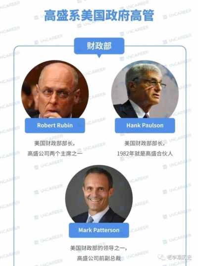 在民主党总统执政期间,高盛集团的CEO亨利·保尔森担任了美国财政部长的职位,而在共和党总统执政期间,高盛集团的高管史蒂夫·姆努钦也担任了美国财政部长的这个职位。