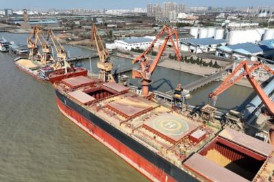 2023年1月3日,江苏南通粮油集团粮食接运码头,车辆、机械和人员正在装载进口粮食。图|视觉中国