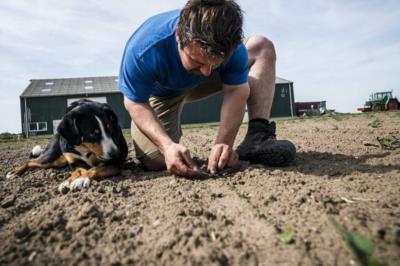 2022年5月18日,荷兰南部的斐济纳特,当地农民在耕地检查土壤情况。