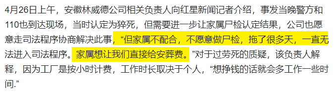 劳务派遣的公司只愿意给丧葬费,但是要求做尸检。由于家属不想破坏女子的遗体,于是连丧葬费都还没有拿到。我想,劳务派遣公司怕是没有这么单纯吧,或许尸检中证明女子健康还有点其他什么问题,连丧葬费都能省了。