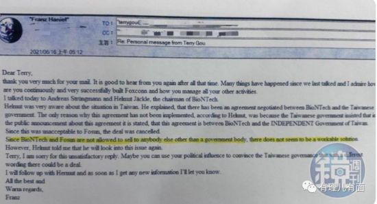 而后又有媒体揭露了BNT大股东的电子邮件。