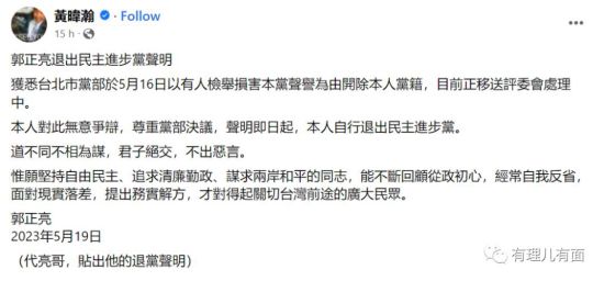 5月19日,“甜蜜周末”前一天,台湾资深媒体人黃暐瀚在脸书代郭正亮发布《郭正亮退出民主进步党声明》。