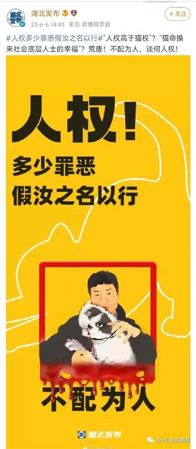 但这个官媒发布这段话语的意思,显然不在这里,而是去批判某些人思维中的人权应该高于“猫权”的观念,进而以一种高高在上的口吻说什么”猫命换来了底层人士的幸福“,然后再直接就说什么”不配为人“了,就说一个社会主义国家的官媒,把人分个三六九等,再大言不惭的说别人不配为人,这样一个代表省级部门的媒体从业者,如此的文字水准,真是难以想象,如此的思维水准,更是令人不齿!