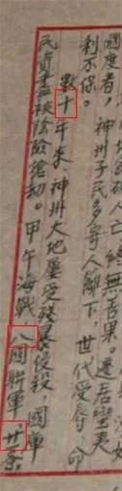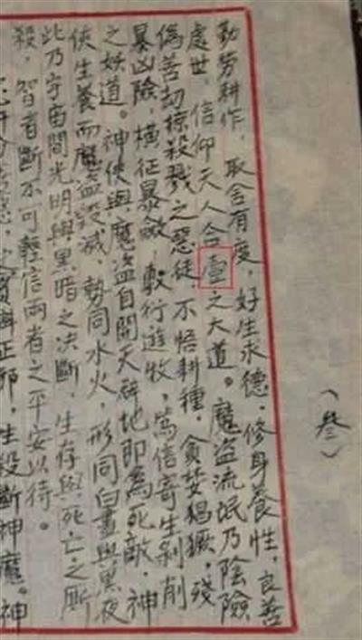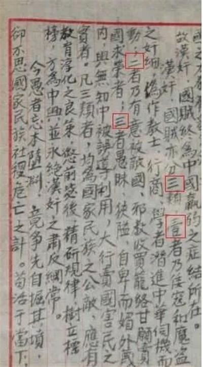 标点符号?对,就是竖行文字中引号的用法。在1919年提出的《请颁布新式标点符号议案》中决定采用曲尺形的引号(『』),1920年2月2日颁布的《通令采用新式标点符号文》使之成为法定的形式,直到1951年新的《标点符号使用方法》颁布后才改为现在常见的西文引号(“”)——而且这还是在横行文字中。如果这个“抄本”确实是1938年的,那应该用的是曲尺形的引号(『』)