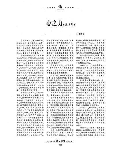 但此文内容早已失传,现已出版的《毛泽东文集》等都未收录此文,包括《毛泽东早期文稿》一书中专门收录大致可以推断是毛泽东早年作品的“副编”也不见《心之力》一文。可见《心之力》全文已不可考。
