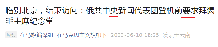 然而,让人觉得意外的是,俄共代表团此次祭拜毛主席如此美好、如此让中国人民为之振奋的消息,过去四五天了,竟没有主流舆论方面的露出,主流搜索引擎、官媒、社交平台等只字不提。最后在一个微不足道的自媒上露出一两张照片,再经由红友接力传播,我们才知道这件事情。