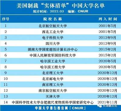 洛阳理工成为此次美国商务部制裁清单上的最新一所中国高校,其实并不是唯一一所高校。在此之前,已经有14所中国高校被列入美国制裁清单。这14所上榜院校基本为985和211,都是以理工科专业见长,他们专精的科研项目涵盖国防、航空、航天、量子、生物和信息技术领域。