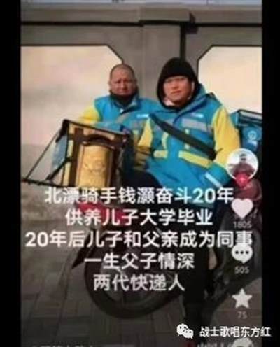 那张图片中有一段文字说明,“父亲北漂20年,供儿子大学毕业”,20年后父子“同框”,成为了送外卖的“战友”。