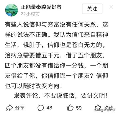 其实,他这种逻辑是完全经不起推敲的。人人皆知的中国革命历史,从井冈山革命根据地到红军二万五千里长征,再到延安时期,尤其是红军二万五千里长征时期,爬雪山、过草地,天上有敌人的飞机轰炸,地上有敌人的围追堵截,红军战士吃皮带,树皮、草根。按这位“正能量秦腔爱好者”的逻辑,我们的红军战士应该是根本不会有“信仰”了。但是,我们要反问这位,我们的红军战士是凭什么顽强地走完了举世闻名的二万五千里长征?再说,解放战争,中国共产党靠着小米加步枪,凭什么打败了国民党的飞机加大炮?这难道不就是信仰的力量吗?中国共产党领导的都是穷苦的泥腿子,他们就是凭着强大的信仰,组织起来,赶走了日本侵略者,消灭了国民党反动派,推翻了压在中国人民头上的三座大山,建立了一个社会主义的新中国,他们靠的就是一个坚定的信仰。请问这位“秦腔爱好者”,这个信仰与“穷富”又有什么关系呢?