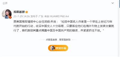 近日某大V爆出美国海军前情报中心主任称:“拉拢中国作家,是一个早在上世纪70年代就开始的行动,收买中国文人十分容易,只要答应他们在海外刊物上发表文章就行了,乘机鼓励其重点揭露中国及中国共产党的错误,并紧紧抓住不放。”