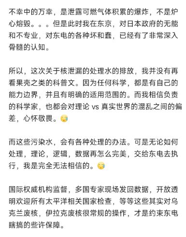 面对这种长期,而且充满未知的问题,笔者本能地保持谨慎态度。因为一旦等到内辐射的长期问题出现的时候,我们就来不及进行补救了。现在这些自以为是,信誓旦旦的自媒体,真的能为十年,二十年,甚至是五十年之后的事情作保证吗?笔者很确定他们不会这么做。到那个时候,他们说不定还会来一些莫名其妙的反思。
