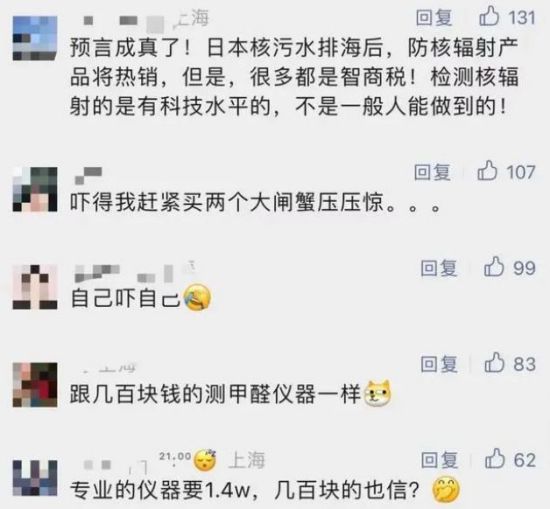 有个熟人也买了检测的仪器,测大理石的那种,然后对着自家桌上几只螃蟹疯狂乱测,结果吓死了,硬说螃蟹被核污水给污染过,不能吃。自己不吃,还不准女婿女儿吃,必须得倒掉,谁敢吃她跟谁急……