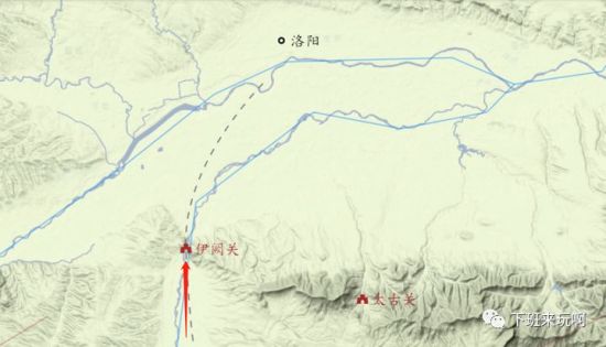 关隘一般是依托特殊地形形成的。某些关隘类似于交通要道,是必经之处,很难绕过去。比如伊阙关。古时候从南边进攻洛阳,一般会走伊阙关。你看下面这个图,伊阙关是在两山之间,左边是山,右边也是山,中间有一条路,我在这个路当口修建防御工事,形成了具有纵深的防御体系,这就是关隘。