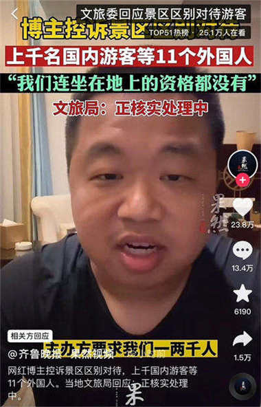 “要中国游客让位给外国游客,还不许站在他们前方。外国友人因吃饭迟到,景区故意推迟演出时间,一两千游客等11个外国人看表演,还拉起警戒线。”