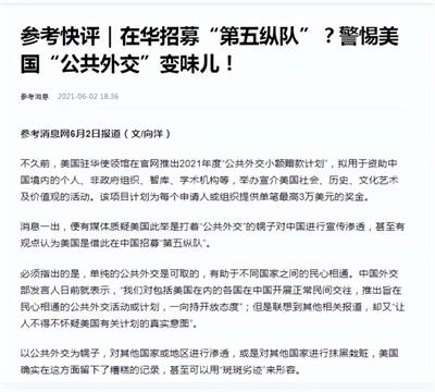 2021年,《参考消息》曾有一篇文章:美国在华招募“第五纵队”?警惕美国“公共外交”变味儿!美国参议院外交委员会通过的《2021年战略竞争法案》里规定,在今后5年中,第一年投入3亿美元,用于打击中国在国际上的影响力。而3亿美元花在什么地方呢?据说就是给那些精美、崇美之人,成为他们抹黑中国的“经费”,这股亲美势力破坏力不能小视。