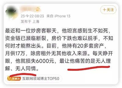 有网友爆料自己和炒房客聊天,对方坦言感到生不如死,之前买了20多套房坐等房价上涨,如今等来的却是房价下跌,资金链断裂,每天都在熬,不知道哪天能熬出头。每天早上睁开眼,就要损失6000块,无人理解,无人同情……