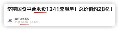 据每日经济新闻昨天的消息,济南国资平台也在甩卖,一次性1341套现房,总价值超过了28亿。