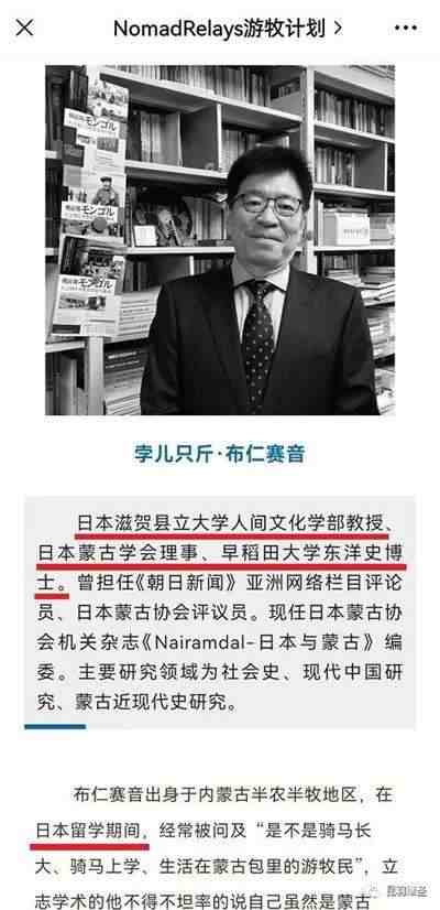 此人名叫孛儿只斤·布仁赛音,1984年毕业后,被分配到内蒙古广播电台当新闻记者,1992年赴日留学,后加入日本国籍。曾担任《朝日新闻》亚洲网络栏目评论员,日本蒙古协会评议员,现任日本蒙古协会机关杂志《Nairamdal-日本与蒙古》编委。主要研究领域为社会史,现代中国研究,蒙古近现代史研究。学术论文有《中国边疆民族研究》等。