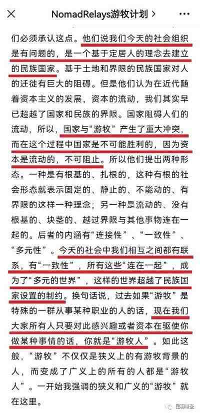“他们说我们今天的社会组织是有问题的,是一个基于定居人的理念去建立的民族国家。……国家与游牧产生了重大冲突,而在这个过程中国家是不可能胜利的,因为资本是流动的,不可阻止。”