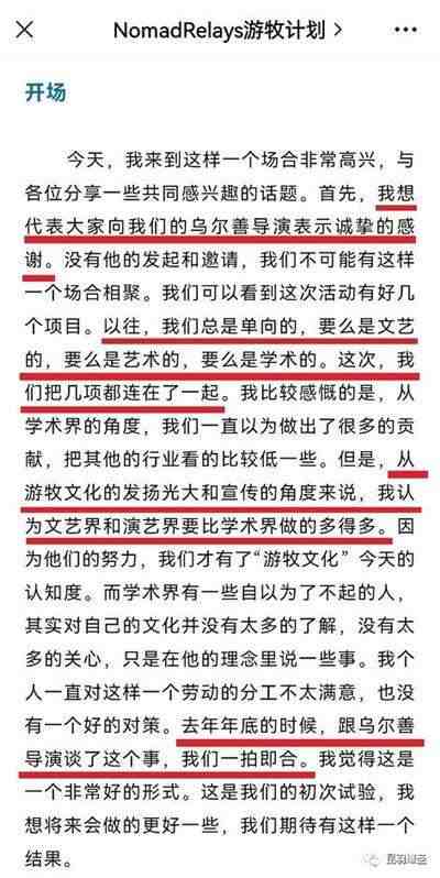 “以往,我们总是单向的,要么是文艺的,要么是艺术的,要么是学术的。这次,我们把几项都连在了一起。……从游牧文化的发扬光大和宣传的角度来说,我认为文艺界和演艺界要比学术界做的多得多。”