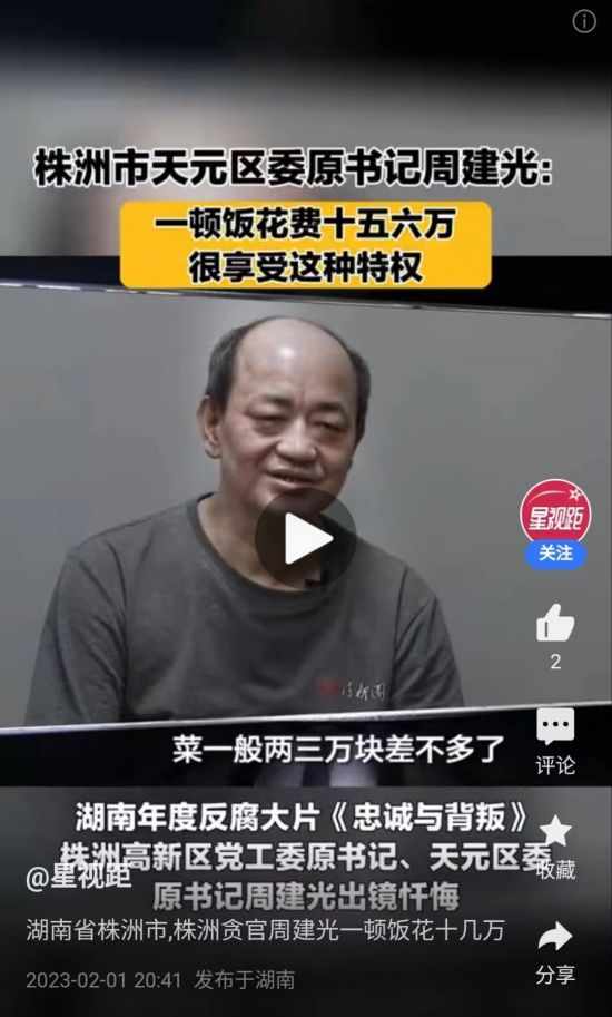 偶尔刷到一段视频,讲的是湖南省株洲市高新技术产业开发区原党工委书记周建光一顿饭吃掉十五六万元公款的事。