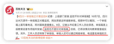 据“百姓关注”报道,最新的回应是称“该摄像头由上级部门安装,并非针对举报箱”。这种回复不具备任何意义,就仿佛是某个官员在演讲台上声情并茂的保证自己不会贪污不会腐败不会以权谋私。事实上,基本所有贪官污吏落马后都被发现“人前一套人后一套”。