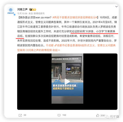 也就是说把原来招牌上的汉字改成“拼音”,再把汉字缩小塞到角落里。