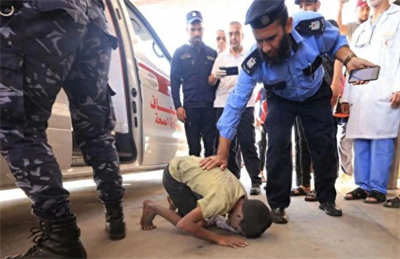 当地时间2023年10月14日,巴勒斯坦加沙地带汗尤尼斯,一名巴勒斯坦男孩在被送往医院后跪在地上亲吻地面。