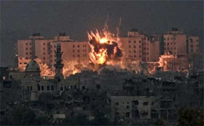 当地时间2023年10月14日,巴勒斯坦加沙地带,以色列轰炸时,一个火球爆炸。