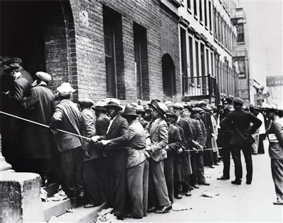 20世纪30年代,美国爆发了一场持续时间久、波及范围广的经济危机,导致大量人口失业。图为1931年纽约失业男子排队等候进入紧急失业救济登记处的情形 视觉中国/供图