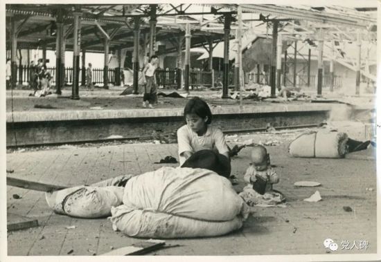 一个周岁大小,浑身是血,伤痕累累的小男孩,坐在火车站铁轨上间的枕木上,惊恐地嚎啕大哭,背景是一片瓦砾的上海南站。