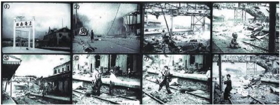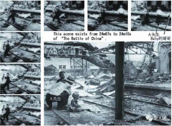 美国电影片《中国之抗战》所辑集的,在4秒时间内拍摄的“中国娃娃”发现及移动过程的新闻片的翻录照片。由右至左至下的说明:1站台下白衣、黑衣两男子在人群中搜求各自的亲人,在白衣人后边现出半个身子的孩子似为已找到的,黑衣人从人堆中抱出幼孩;2黑衣人抱着幼孩转身走向对面站台;3跨过铁轨;4又跨过一道铁轨,行走时身旁突然发生变化;6抬腿向前,7原来向前的右腿突然后退,身子可能受到异物的冲击而下蹲,难忍的痛疼,迫使黑衣人不得不把幼孩放在近旁的站台边上;8白衣人领着大孩子与幼孩会合。请注意此时幼孩似已见到父亲而不像在图3时那样的哭嚎了。(图内注字均是原有的)