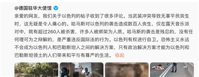 从截图中的文字看,德国大使馆说得似乎振振有词,但只字不提导致这一切的历史原因,即以色列立国后有上百万巴勒斯坦人被驱离自己的家园,至今不能返回故土;也只字不提导致这一切现实原因,即230多万巴勒斯坦被圈禁在加沙这个“世界最大的露天集中营”中,过着生不如死的生活,似乎纯粹是巴勒斯坦人毫无理性地非要去袭击以色列——如此片面的说辞,在信息时代的今天,又能骗得了谁呢?