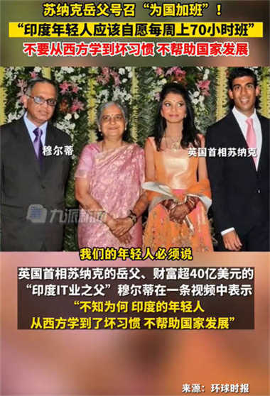 据媒体报道,英国首相苏纳克的岳父、财富超40亿美元的“印度IT业之父”穆尔蒂在一条视频中表示,“不知为何,印度的年轻人从西方学到了坏习惯,不帮助国家发展。”穆尔蒂称,2075年印度有望成为“世界第二大经济体”。为与中国等国家竞争,印度需要”意志坚定、纪律严明、工作勤奋”的年轻人。“我要求年轻人必须说,‘这是我的国家,我想每周工作70个小时’。”